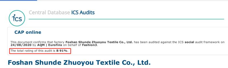 祝佛山市順德區卓優紡織品有限公司在創思維驗廠網輔導下一次性通過AQM審核ICS驗廠取得B級91分