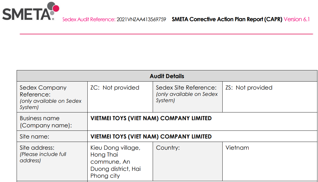 越美玩具(越南)有限公司【VIETMEI TOYS (VIET NAM) COMPANY LIMITED】在創思維技術服務(越南)有限公司輔導中2021順利通過ITS突擊審核的Sedex 4P驗廠,創思維2020年還幫助貴司順利通過ICTI驗廠。