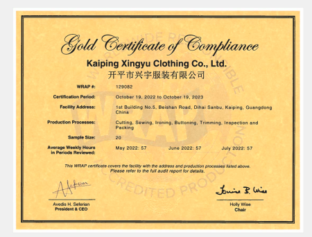 在創(chuàng)思維驗廠網(wǎng)老師專業(yè)技術(shù)、全程跟進耐心細致輔導以及公司全體員工配合下,一次性順利通過WRAP認證,為將來公司發(fā)展奠定了良好的發(fā)展基礎,既開拓了市場同時也增加了消費者對公司的信賴,在這里再次祝賀開平市興宇服裝有限公司2022年一次性成功通過WRAP認證,同時也期待未來再次與創(chuàng)思維驗廠網(wǎng)合作!