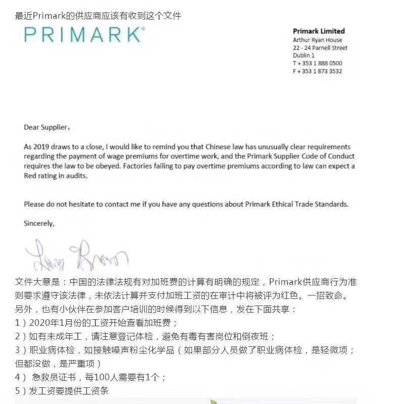 文件大意是:中國的法律法規有對加班費的計算有明確的規定, Primark供應商行為準則要求遵守該法律,未依法計算并支付加班工資的在審計中將被評為紅色。一招致命,另外,也有小伙伴在參加客戶培訓的時候得到以下信息,發在下面共享: