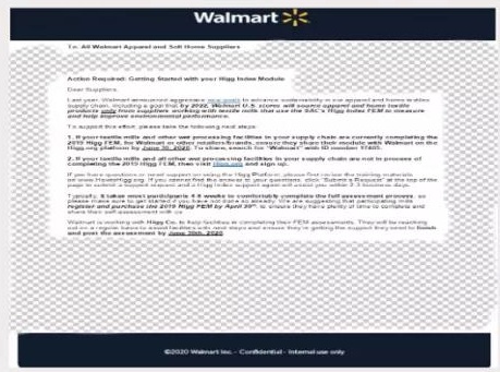 “《關于推進供應商開始使用HIGG工具的要求》親愛的供應商,去年,沃爾瑪宣布在服裝和家紡供應鏈中推進可持續性發展方面的新目標:其中之一就是截止2022年,美國沃爾瑪百貨將會只從那些參與使用了HIGG作為環境評估工具和改善工具的服裝與家紡廠下單采購。