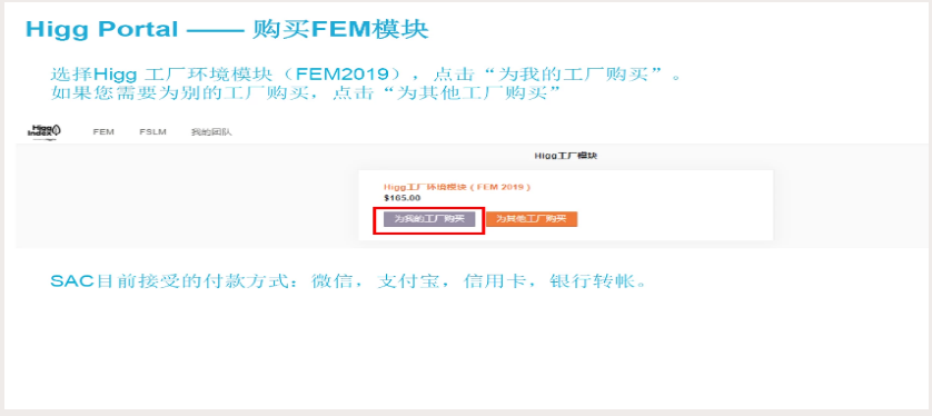 完成付款并得到確認(rèn)后,可進(jìn)入自界面開始填寫;HIGG FEM自評模塊一共分為8個(gè)方面: